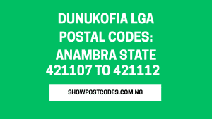 Dunukofia Postal Codes range from 421107 to 421112. This local government area is located in Anambra State, South-East Geopolitical Zone